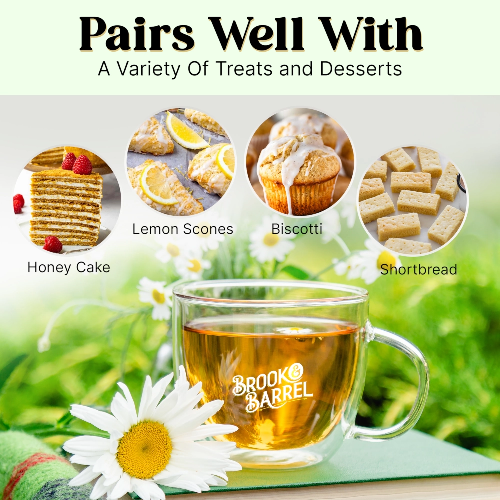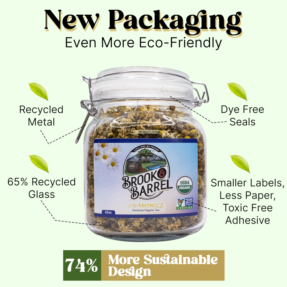 Above all, Brook & Barrel tea is stored in eco-friendly, health conscious packaging that preserves flavor and protects the health of our customers. Taste the organic difference grown by Brook & Barrel Farms with care and passion. Experience the natural goodness of the delicate flavors of chamomile in its purest form.